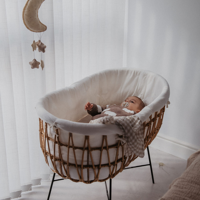 Кроватку лучше поставить подальше от окон, дверей и обогревателей. В кроватке не должно быть подушек, одеял, игрушек и мягких бортиков, так как они повышают риск удушья. Спальня должна быть хорошо освещена днем и иметь ночник с мягким светом для ночного кормления и ухода. Среди необходимой мебели для детской можно выделить кроватку, матрас, мобиль над кроваткой, комод с пеленальным столиком, матрасик для пеленального столика, кокон или люльку, ночник и кресло-качалку (если позволяет место).