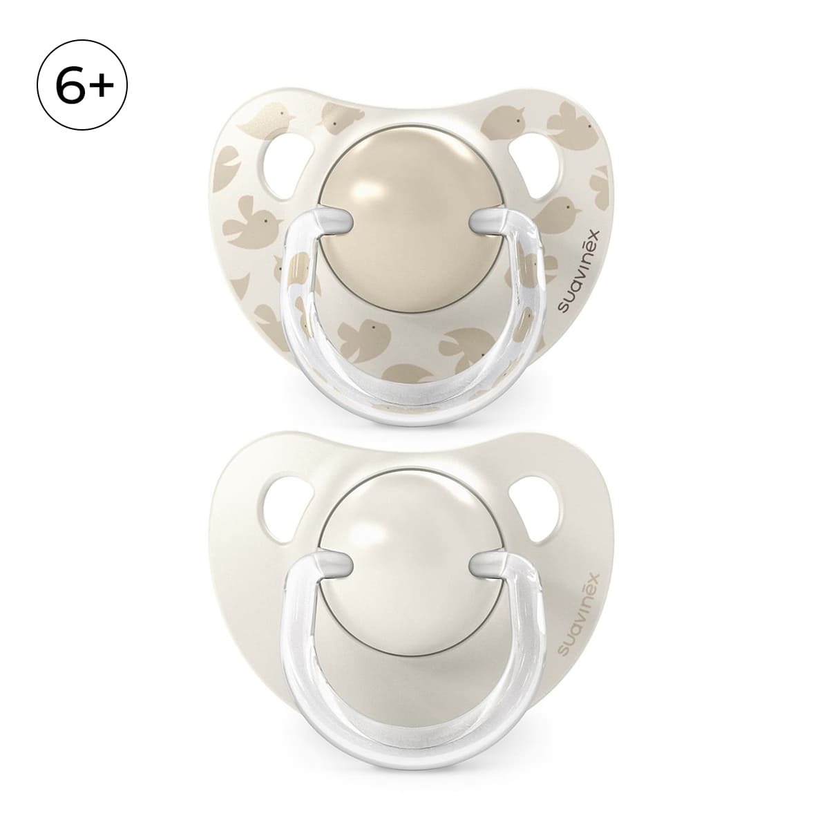 Анатомическая пустышка Suavinex с соской со скошенным краем анатомически правильно располагается во рту ребенка, не препятствуя естественному развитию ротовой полости и прикуса.