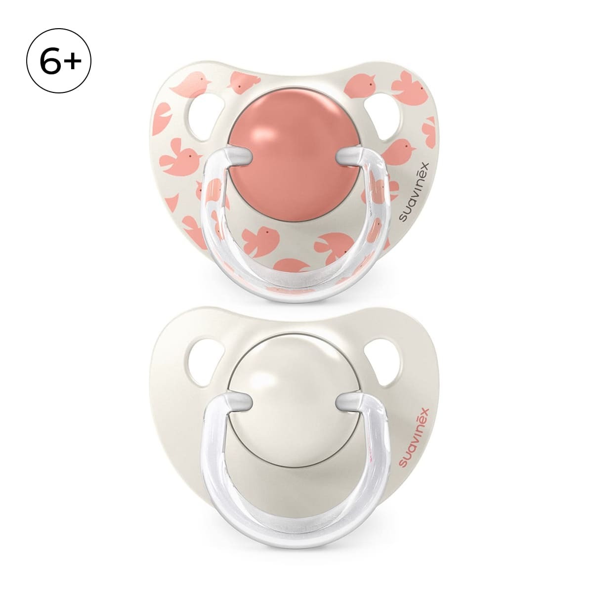 Анатомическая пустышка Suavinex с соской со скошенным краем анатомически правильно располагается во рту ребенка, не препятствуя естественному развитию ротовой полости и прикуса.
