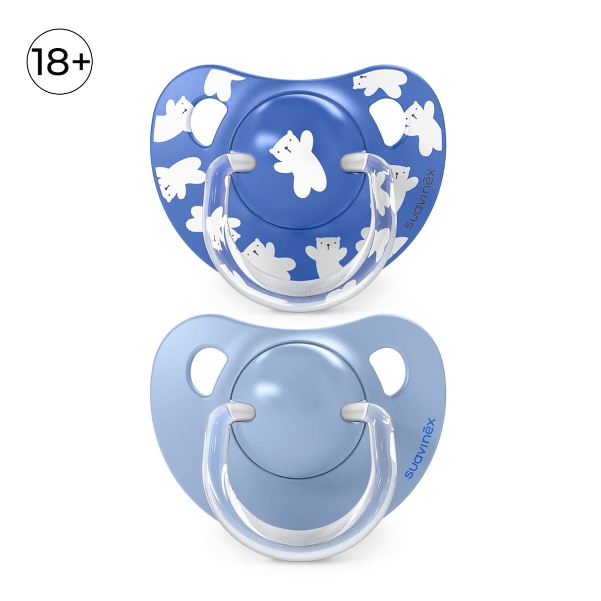 Анатомическая пустышка Suavinex с соской со скошенным краем анатомически правильно располагается во рту ребенка, не препятствуя естественному развитию ротовой полости и прикуса.