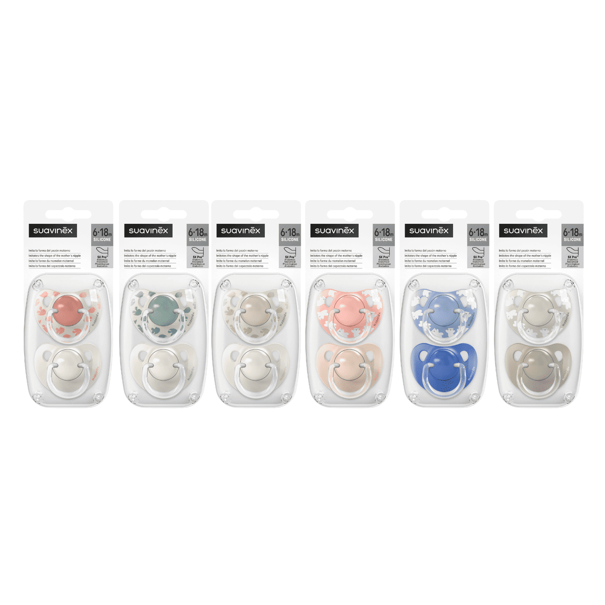Анатомическая пустышка Suavinex с соской со скошенным краем анатомически правильно располагается во рту ребенка, не препятствуя естественному развитию ротовой полости и прикуса.