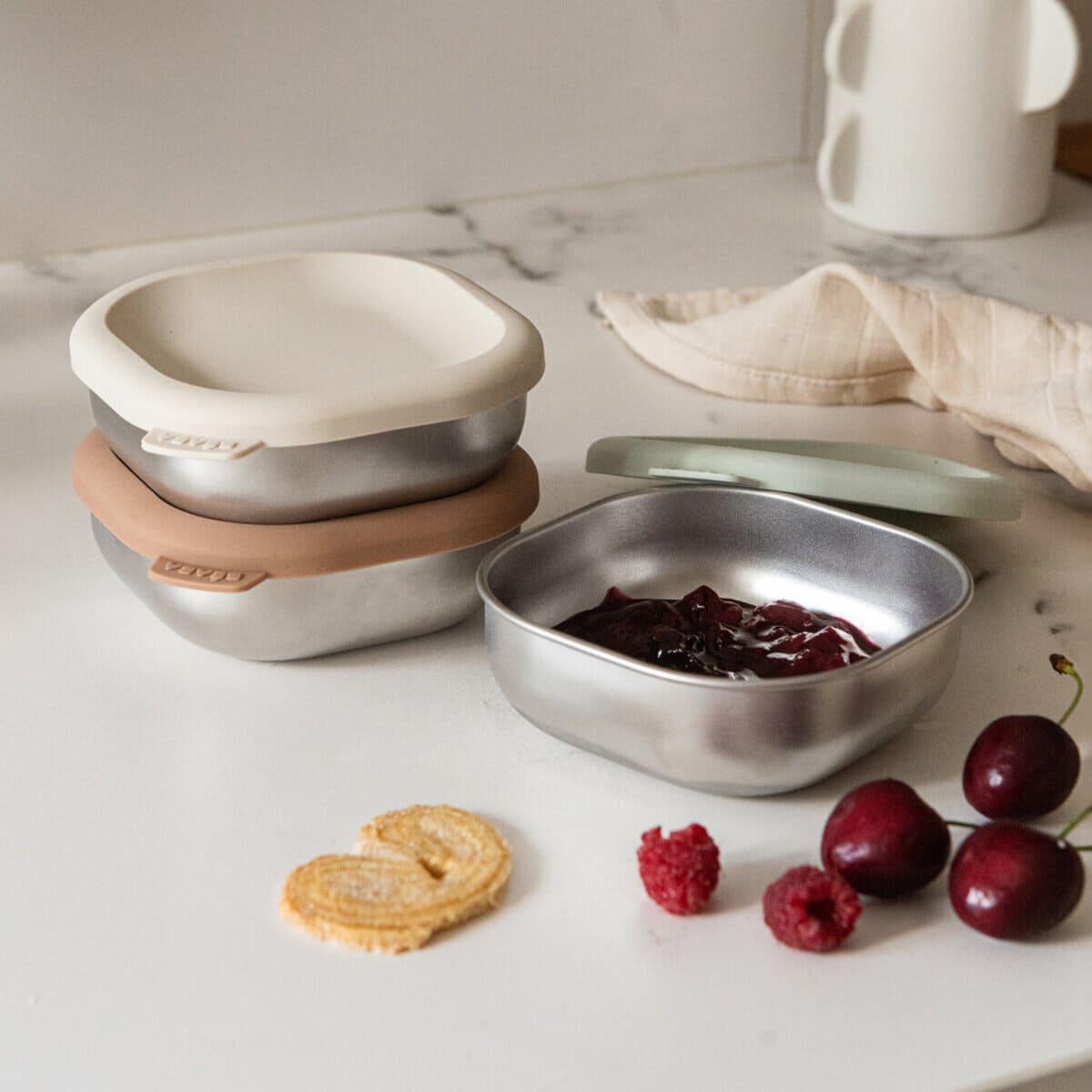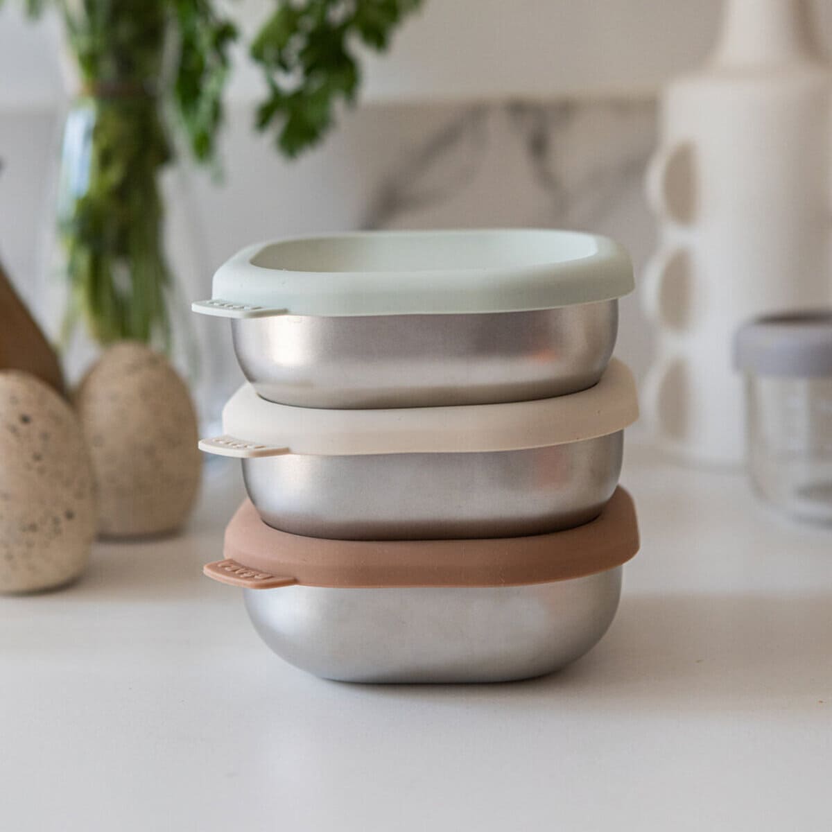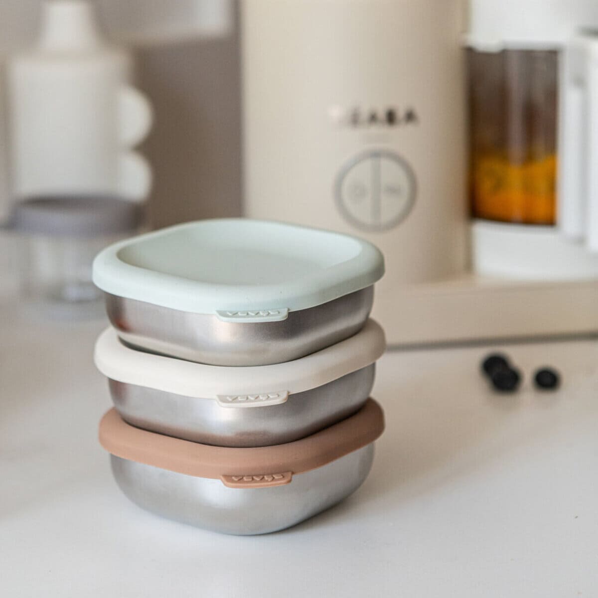 Набор из 3-х контейнеров из нержавеющей стали с силиконовыми крышками подходит для хранения, транспортировки и разогрева первых домашних блюд. Объем 250 мл – оптимальный размер для небольших порций, подходящих для начала прикорма. Контейнеры удобно использовать как дома, так и в поездках. Когда малыш подрастет, эти контейнеры можно использовать в качестве ланч-боксов и брать их в детский сад или школу.