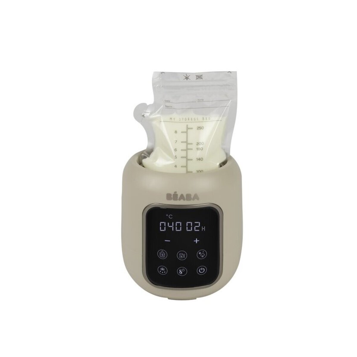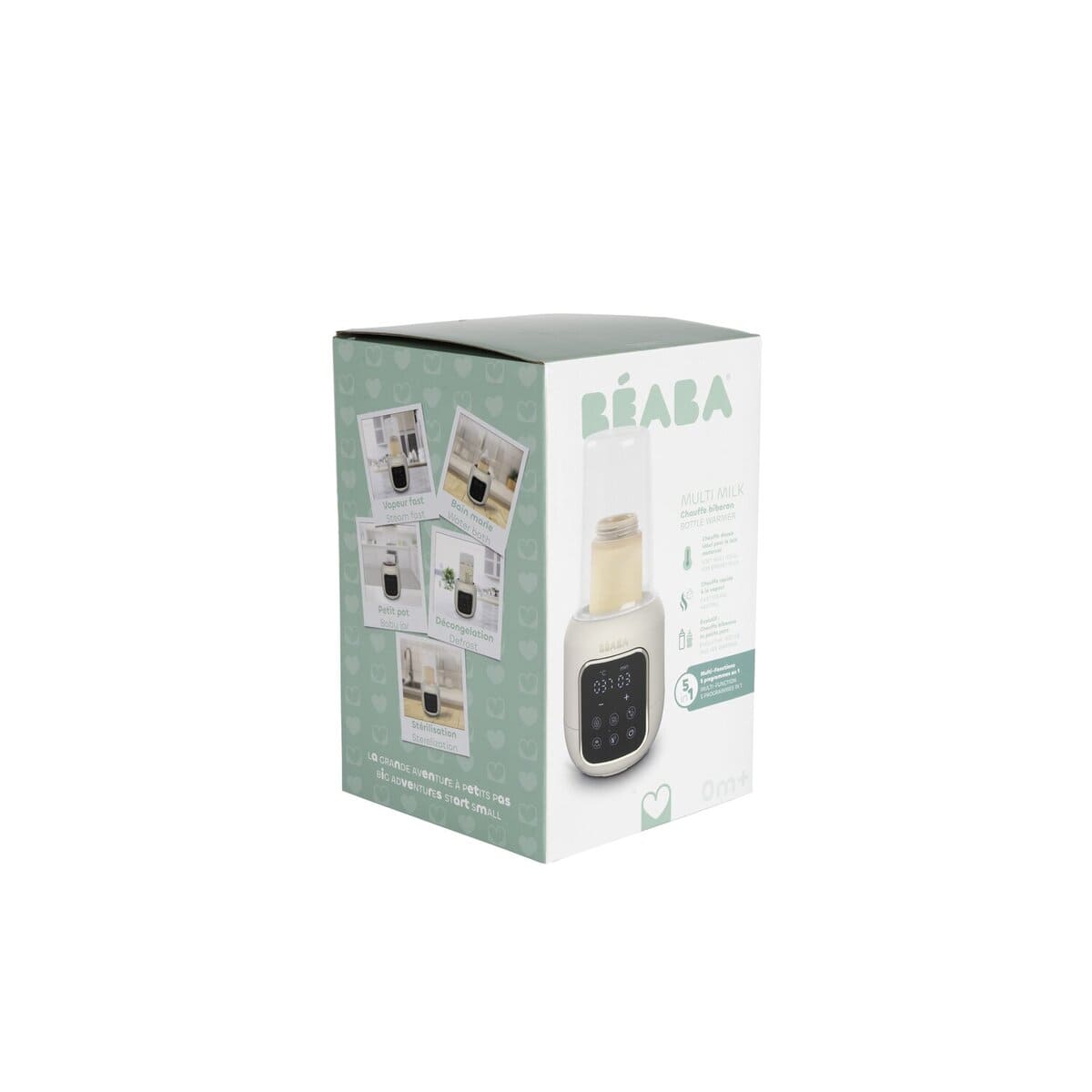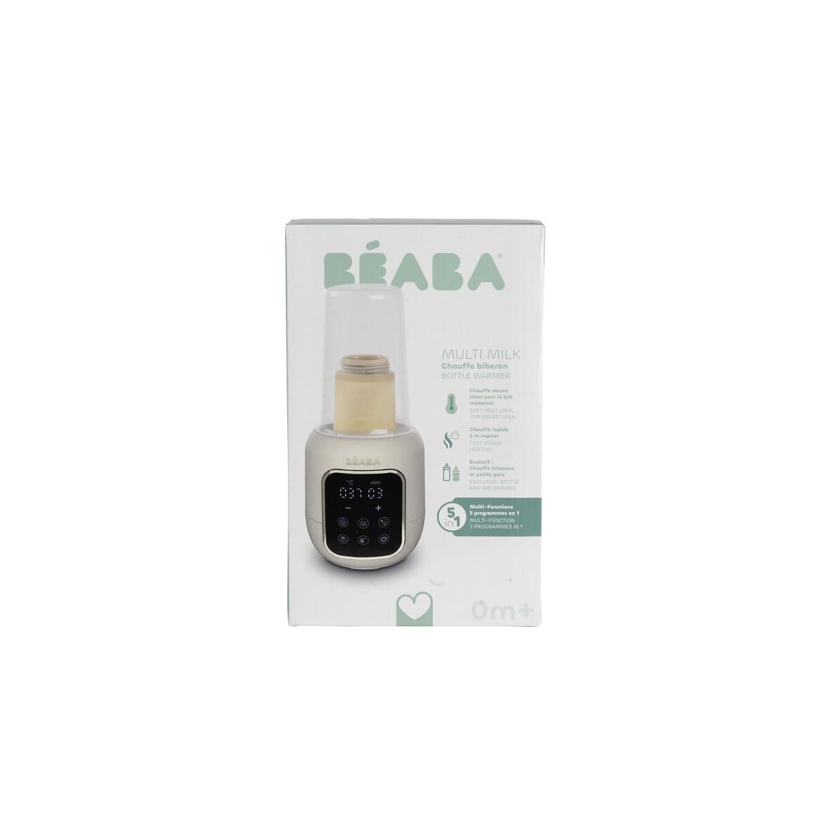 Многофункциональный подогреватель BEABA имеет 5 функций: водяная баня, приготовление детского питания, стерилизация, размораживание, быстрая разморозка. Режим водяной бани бережно нагревает грудное молоко, сохраняя его питательные вещества. Режим быстрого нагрева быстро нагревает бутылочку с молоком с помощью пара. Режим стерилизации стерилизует бутылочки, соски и пустышки за 10 минут. Подогреватель обеспечивает равномерный нагрев бутылочки с молоком. Устройство оснащено сенсорным экраном с подсветкой для удобства использования.