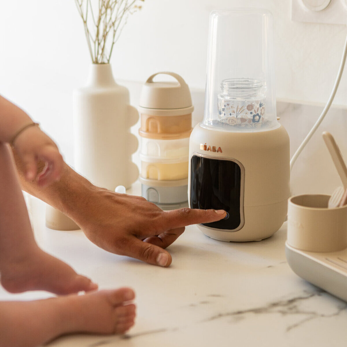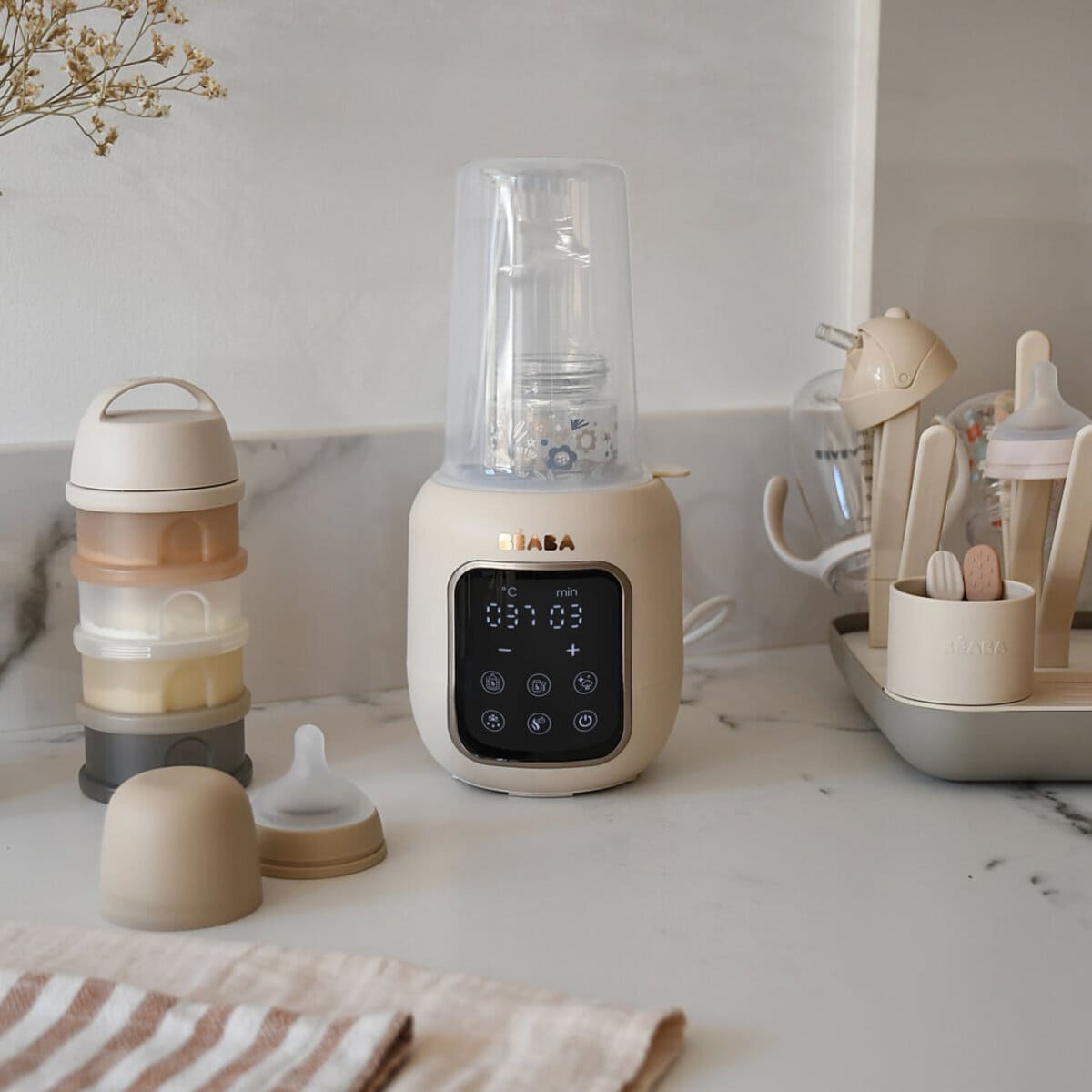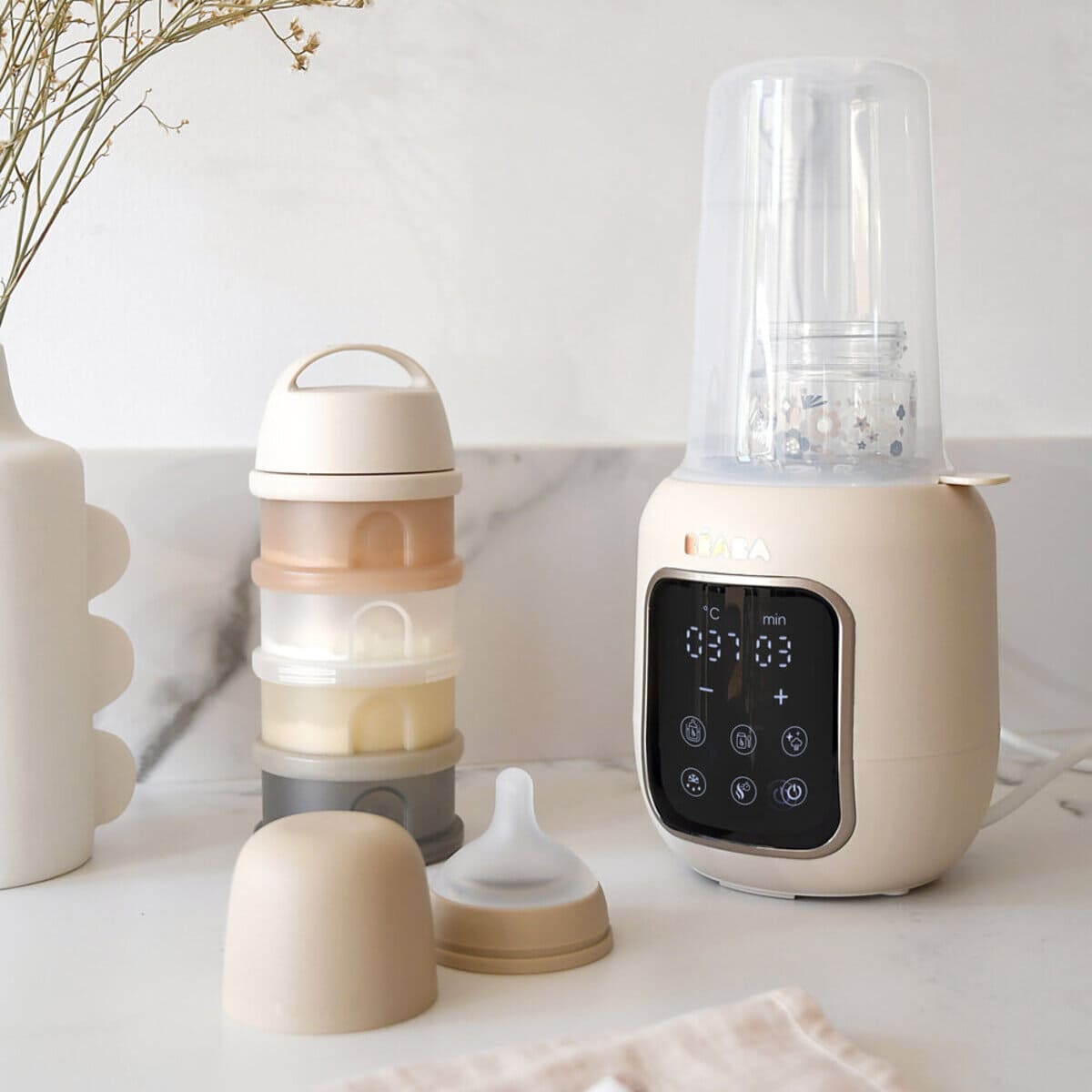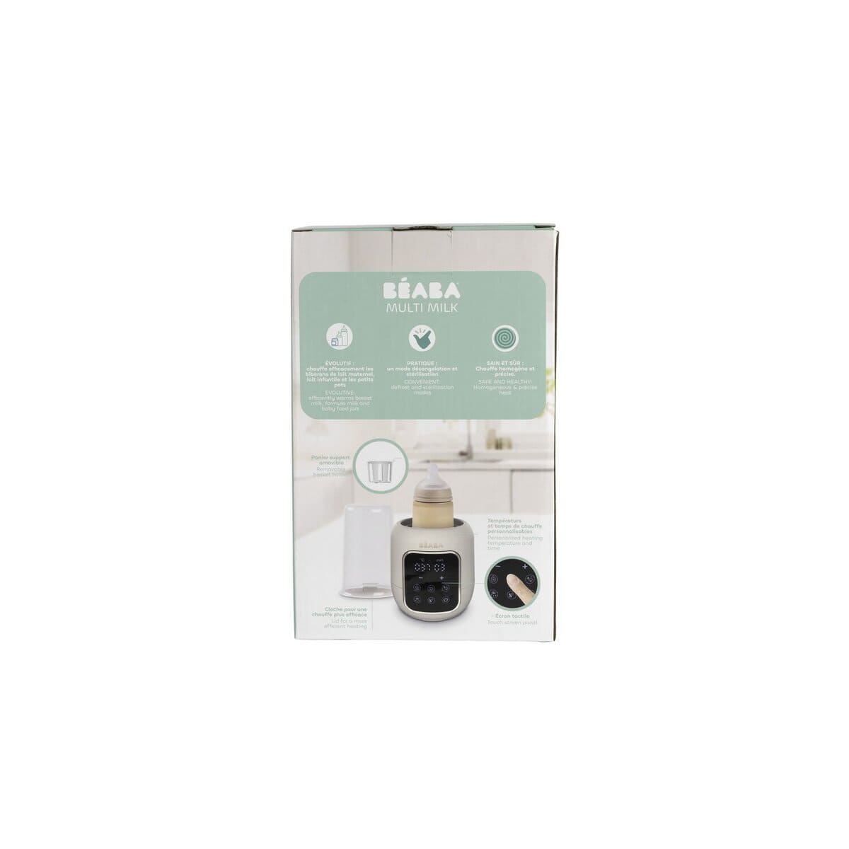 Многофункциональный подогреватель BEABA имеет 5 функций: водяная баня, приготовление детского питания, стерилизация, размораживание, быстрая разморозка. Режим водяной бани бережно нагревает грудное молоко, сохраняя его питательные вещества. Режим быстрого нагрева быстро нагревает бутылочку с молоком с помощью пара. Режим стерилизации стерилизует бутылочки, соски и пустышки за 10 минут. Подогреватель обеспечивает равномерный нагрев бутылочки с молоком. Устройство оснащено сенсорным экраном с подсветкой для удобства использования.