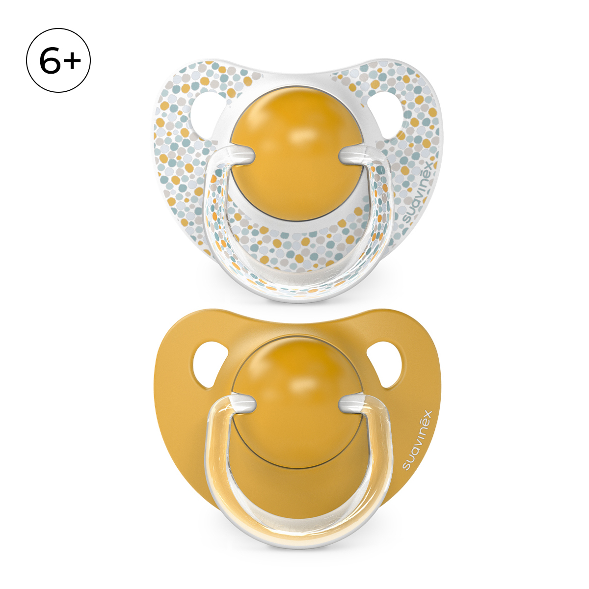 Анатомическая пустышка Suavinex с соской со скошенным краем правильно располагается во рту ребенка, не препятствуя естественному развитию ротовой полости и прикуса. Корпус пустышки имеет специальные вентиляционные отверстия и не вызывает раздражения в периоральной зоне.