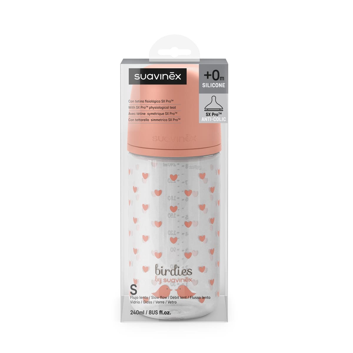 Антиколиковая стеклянная бутылочка Suavinex с силиконовой физиологической соской SX Pro делает процесс кормления максимально естественным и помогает предотвратить возникновение коликов.