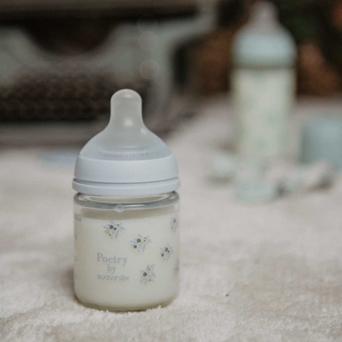 Стеклянная бутылочка для кормления Suavinex Poetry SX PRO 120 мл, медленный поток, 0+ мес, голубая